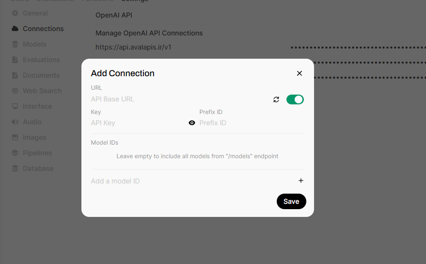 وقتی که open WebUI بالا اومد باید برید بخش admin panel، بعد بخش setting و بعد بخش connection اطلاعات مربوط به ماشین تون رو وارد کنید
