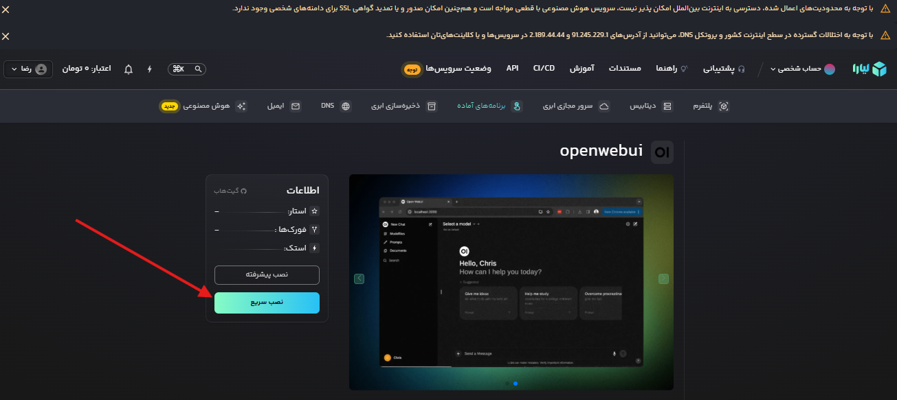 من روی سیستمم داشتم و با دستور open-webui serve در کامندلاین ویندوز، اون رو اجرا کرد؛ شما اگر ندارید باید روی پنل لیارا بعد از ثبت نام و اینجور داستانها وارد بشید و دکمه نصب سریع رو بزنید (قاعدتا اگر به اولیه های مربوط به تنظیم کنسول و ماشین ها مسلط هستید برید تنظیمات خودتون رو انجام بدید)