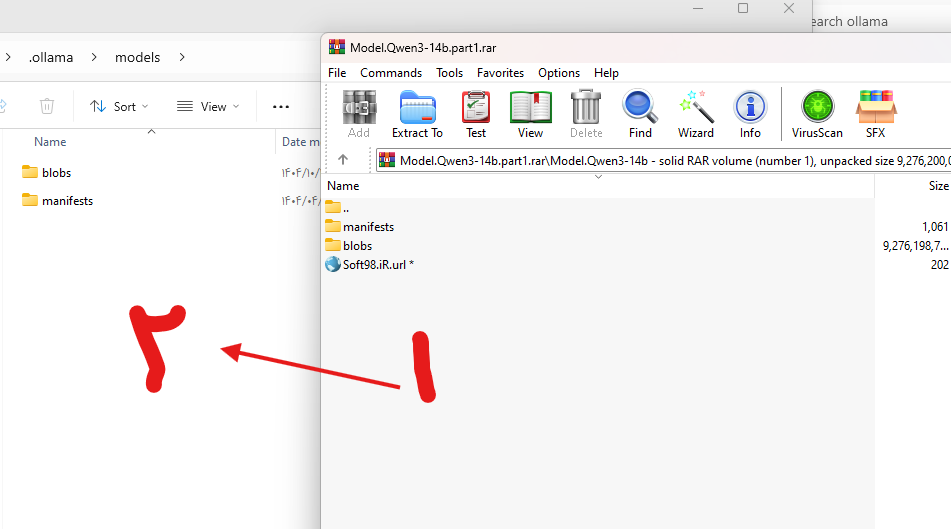 رو بزنید (به نقطه اول کلمه توجه کنید!)؛ بعد وارد فولدر مدل میشید و دو تا بخشی که از فایل زیپ مربوط به مدل هست رو داخل این پوشه مدل، وارد میکنید. دو تا بخش مربوط به مدل و مانیفست تو این مرحله به ollama اضافه میشه