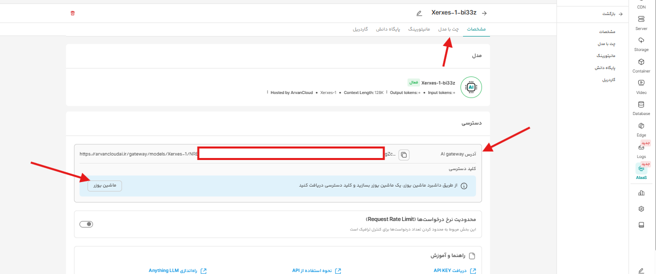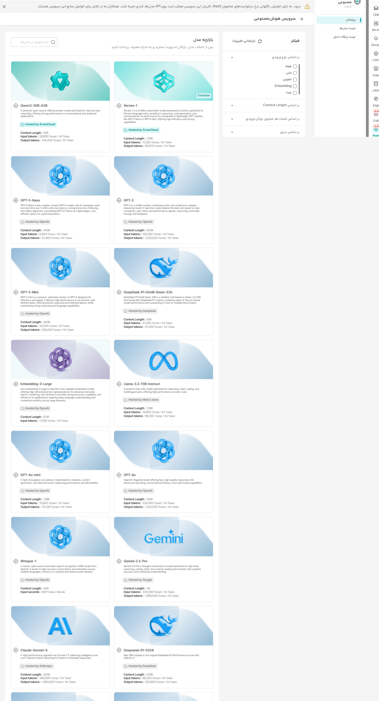 تو روش اول شما دارید از منابع سیستمتون برای پاسخ گرفتن از مدلها استفاده میکنید، به هر دلیلی شاید این براتون امکان پذیر یا مطلوب نباشه، میتونید این منابع رو از سرویسهای ابری استفاده کنید, برای این کار نیاز هست به پنل یکی از سرویس دهندههایی که مدلهای مختلف رو ارائه میدهند وارد بشید و از بین مدلهایی که موجود هست، مدلی که هاستینگش روی ایران هست رو، انتخاب کنید؛ مثلا تو تصویر زیر من از آروان کلاد عکس گرفتم و اگر ببینید، برخی از این ها، نوشته هاست توسط سرویس آروان اتفاق میافته (گفتنی هست که من تست کردم و سرویسدهی این مدلها در شرایط ویژه، واقعا تعطیل هست! در شرایط عادی هم بهتره برید سراغ اون هایی که هاستش توسط سرویسهای دیگه اتفاق می افته و یا حتی برید سراغ گرفتن api از سرویسهای wrraper)